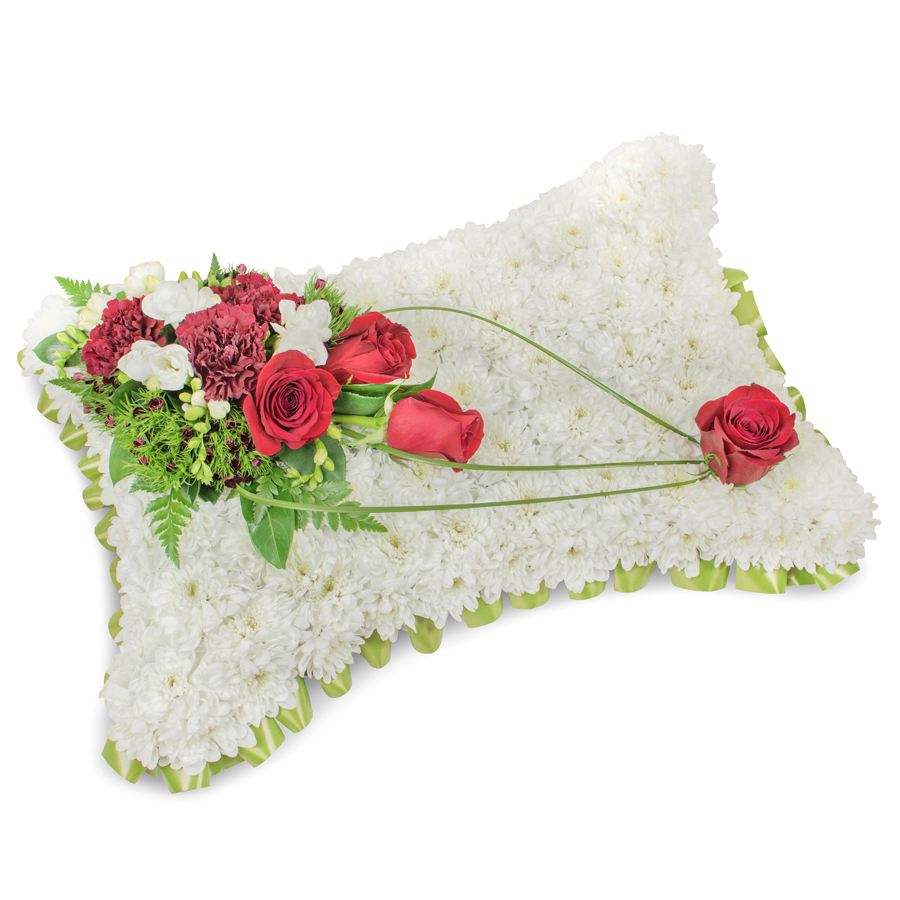 Share your sympathies with our thoughtfully crafted arrangement featuring white chrysanthemums, red roses, white freesias, dark red carnations, dianthus, and bear grass. Each flower is chosen to symbolize honor and remembrance.